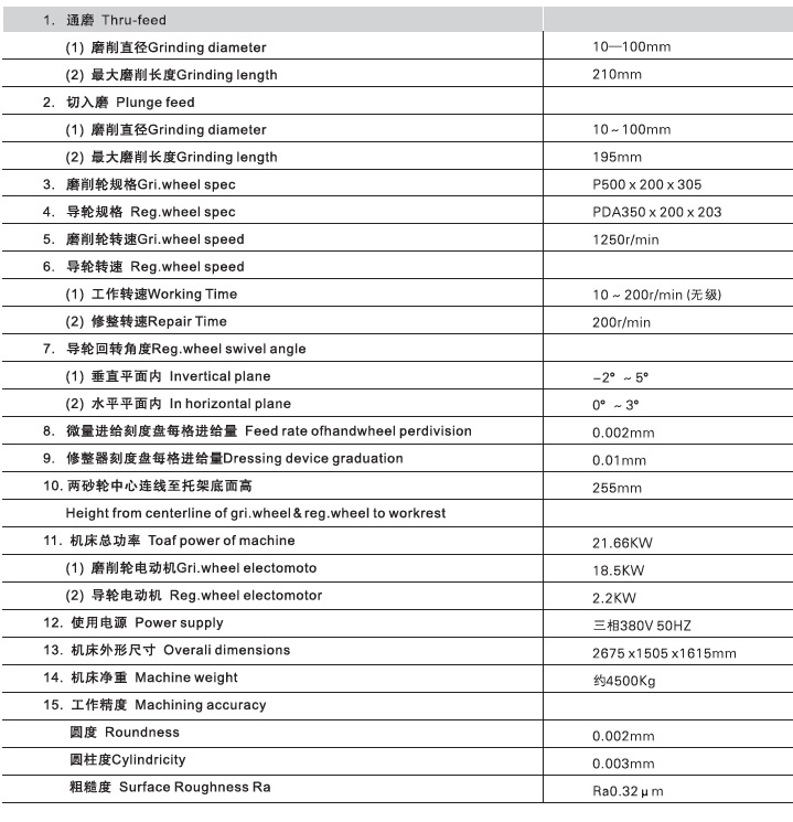 本机床可用于对各种圆柱体零件,环形零件及长棒料进行无心通磨加工,对圆维度小于1:20的圆锥体和各种成型回转体零件的元心切入磨削加工,适用于成批和大量生产需要。